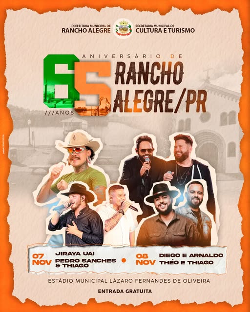 Nos dias 07 e 08 de novembro, o Estádio Municipal Lázaro Fernandes de Oliveira de Rancho Alegre será palco de uma festa inesquecível, em comemoração dos 65 anos do município.