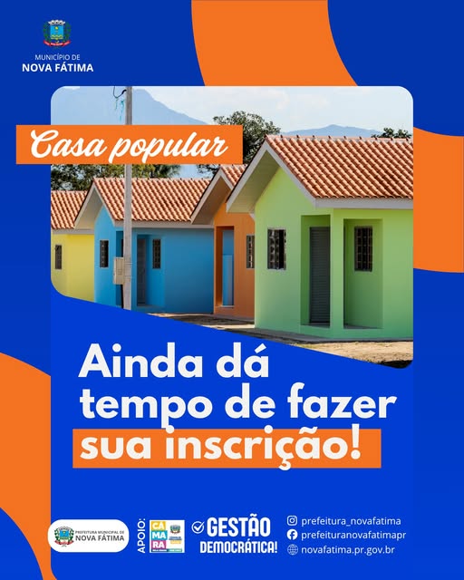 A Prefeitura Municipal de Nova Fátima, a Câmara de Vereadores e o Departamento de Habitação informam que continuam abertas as inscrições da Cohapar para quem deseja participar da seleção de cadastro para futuros programas habitacionais.