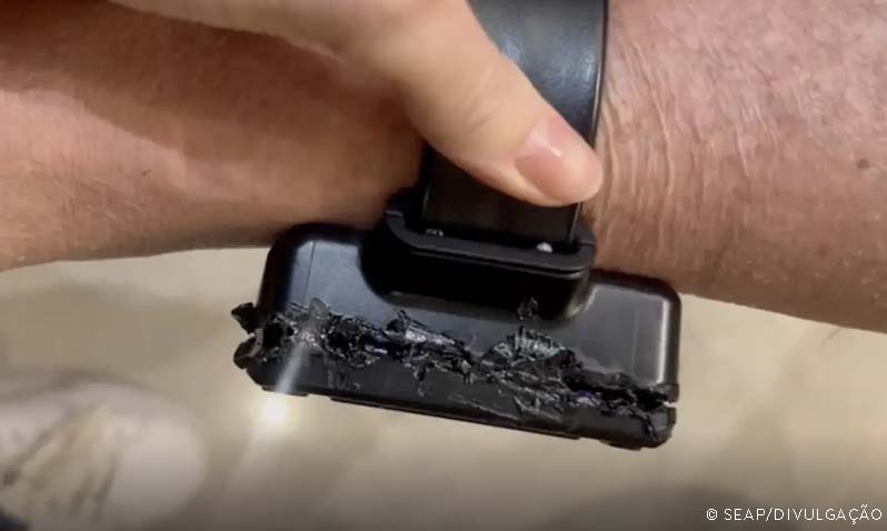 “O equipamento possuía sinais claros e importantes de avaria. Haviam marcas de queimadura em toda sua circunferência, no local de encaixe/fechamento do case. No momento da análise o monitorado foi questionado acerca do instrumento utilizado. Em resposta, informou que fez uso de ferro de solda para tentar abrir o equipamento”, diz o relatório.