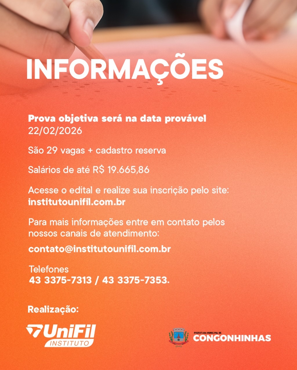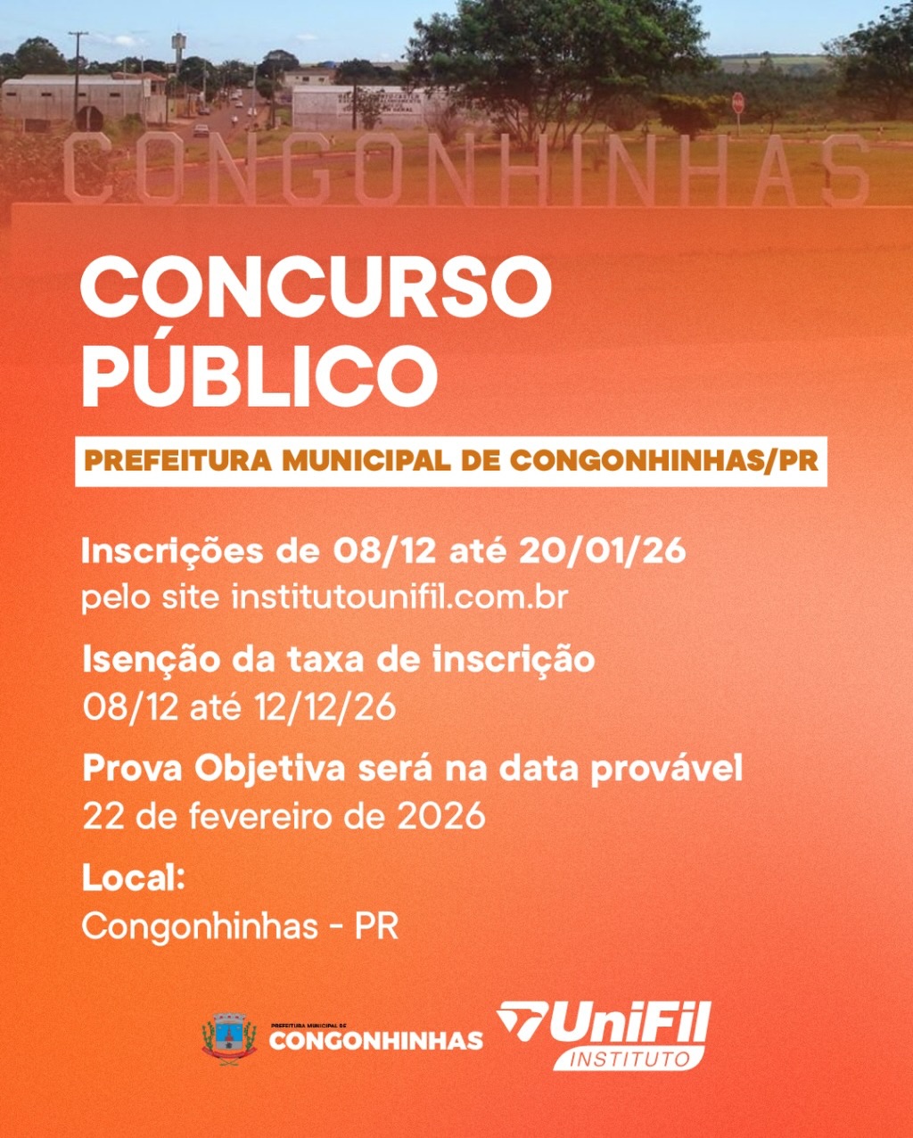 A data provável da prova objetiva será dia 22 de fevereiro de 2026 em Congonhinhas.