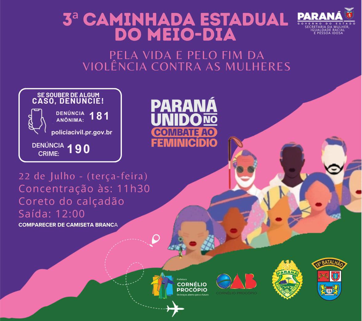 Na próxima terça-feira (22/7), a Prefeitura de Cornélio Procópio, por meio da Secretaria da Mulher, promove a 3ª Caminhada do Meio-Dia, um ato contra o feminicídio e pelo fim da violência contra a mulher. A concentração será no Coreto do Calçadão, às 11h30, com saída prevista para as 12h.