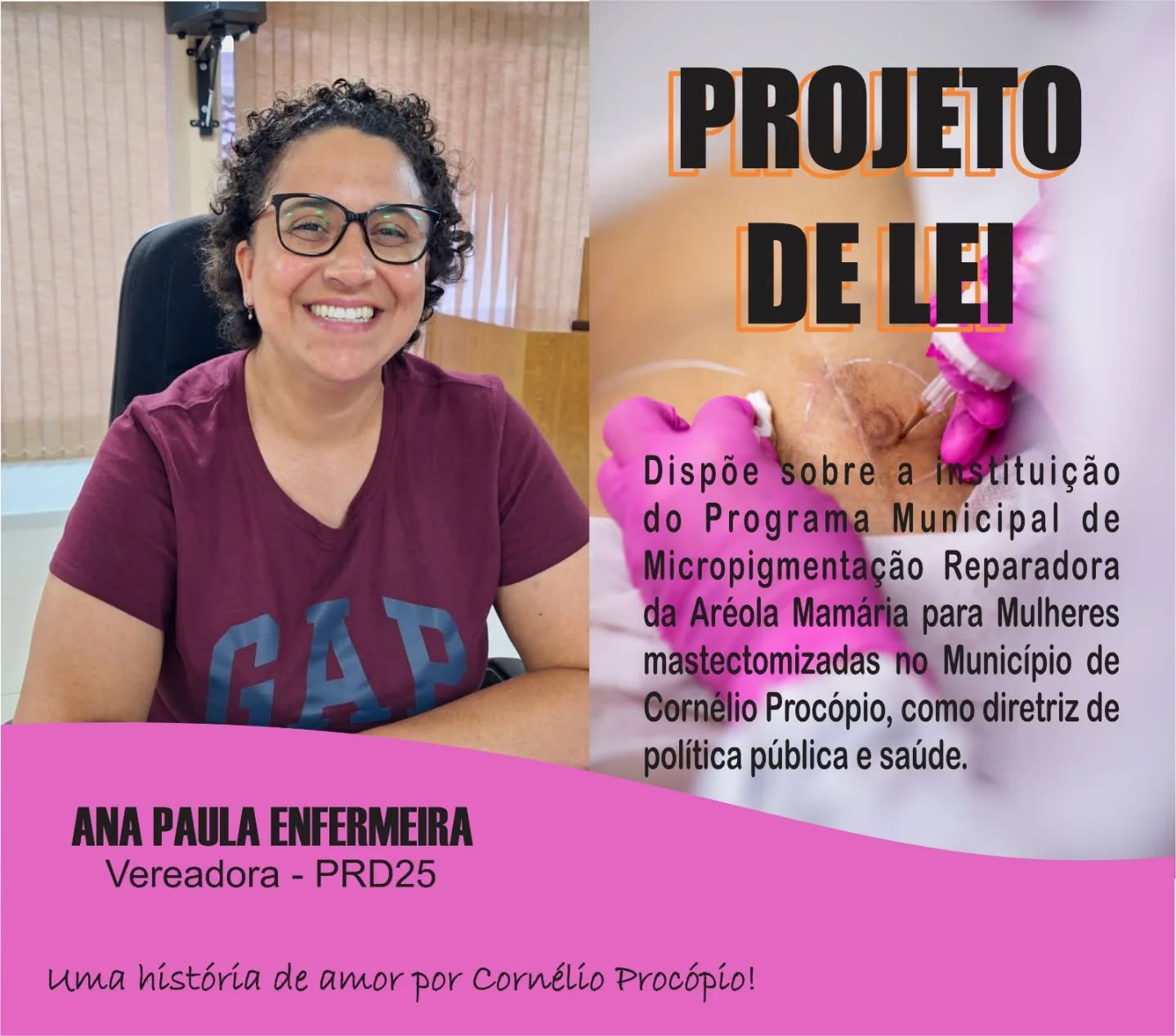A vereadora Ana Paula Ferreira, apresentou um Projeto de Lei que institui o Programa Municipal de Micropigmentação Reparadora da Aréola Mamária em Cornélio Procópio. A proposta, que passou pela primeira votação na última segunda-feira (06), visa oferecer um tratamento estético e reparador a mulheres que passaram por mastectomia total ou parcial, decorrente do tratamento de câncer de mama ou de outra condição clínica devidamente atestada.