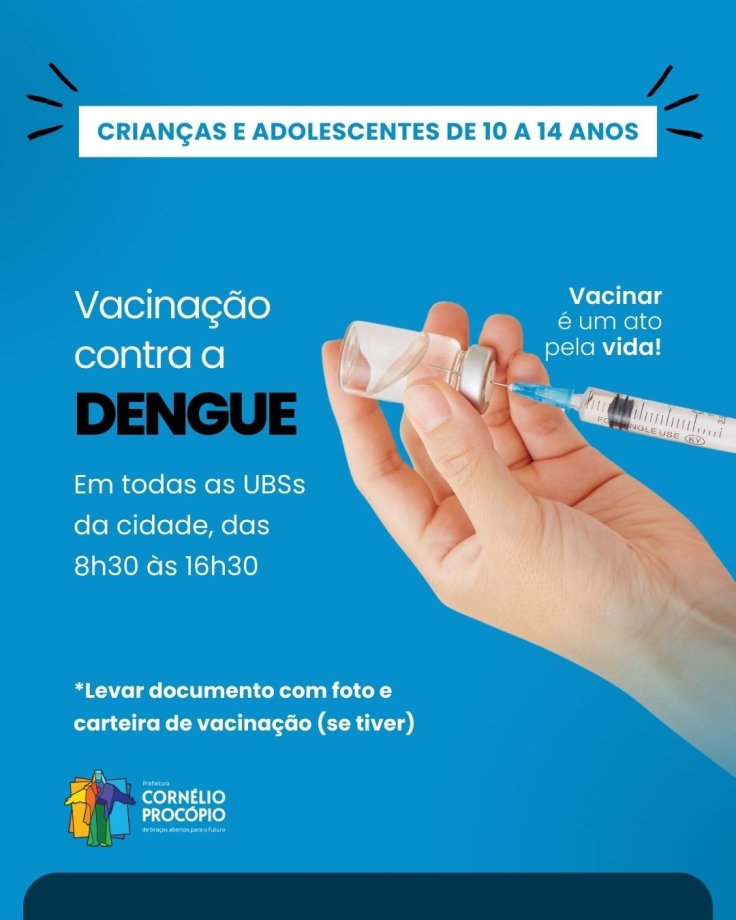 Cornélio Procópio deu início a vacinação contra a dengue para crianças e adolescentes de 10 a 14 anos, seguindo as orientações do Ministério da Saúde. Essa faixa etária foi escolhida devido a estudos que indicam um maior risco de complicações da doença nesse grupo.